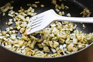In same frying pan, add 1 tsp. more olive oil and heat, then add onions and saute 3-4 minutes until onions are softened. Add thyme, ground poultry seasoning, salt, and pepper, and saute about 2 minutes more.